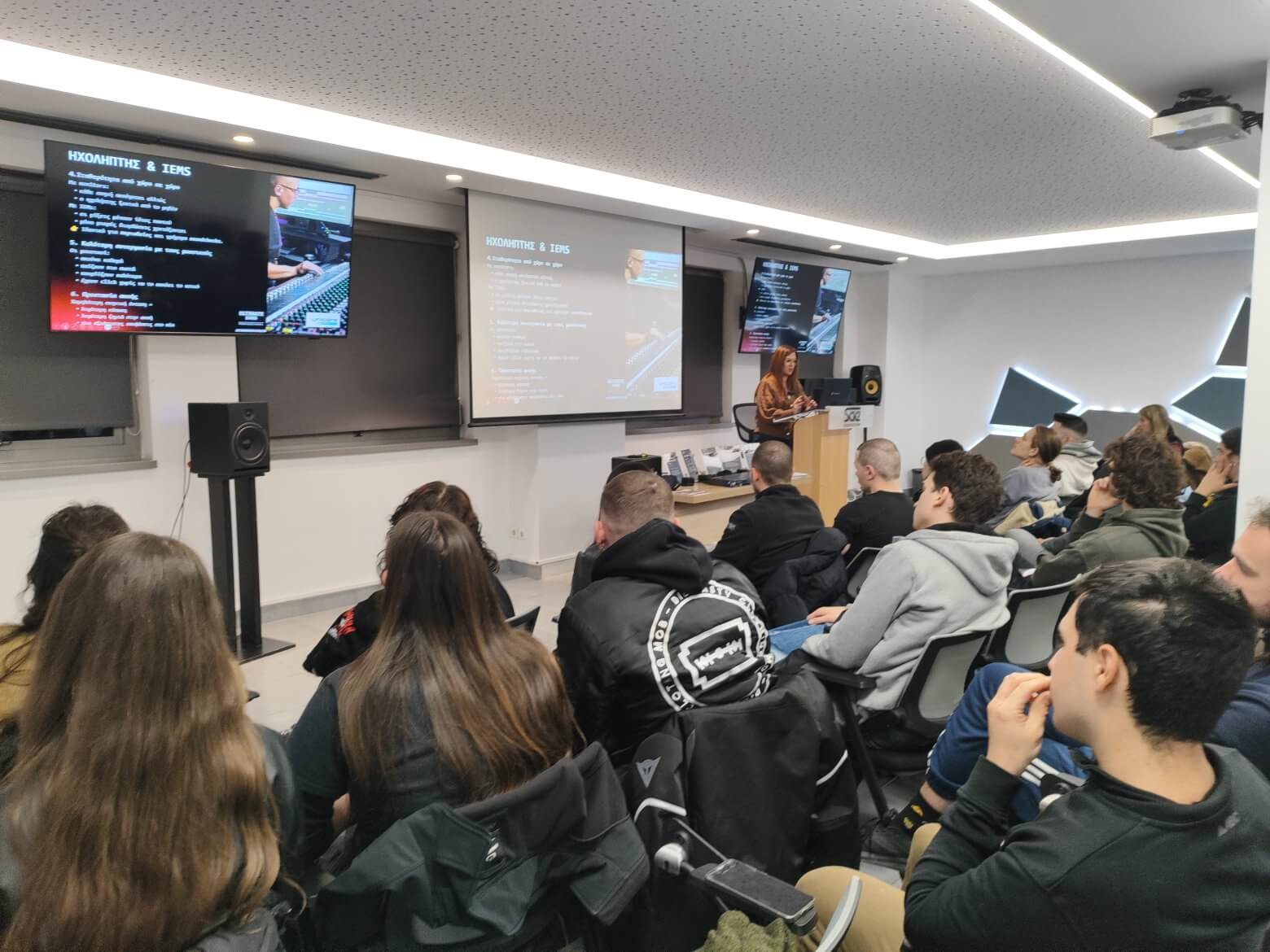 Στη συνέχεια η Τζίνα Ανδρεάδη, εκπρόσωπος της Unicare μίλησε περισσότερο για τον ενδεδειγμένο εξοπλισμό και έδωσε την ευκαιρία στους σπουδαστές να δοκιμάσουν τα διαθέσιμα In-Ear Monitors.