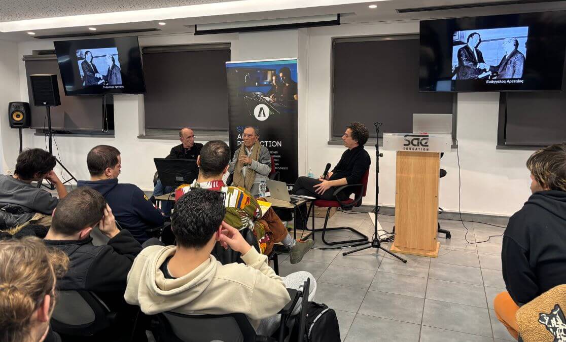 Η SAE Athens είχε τη χαρά να φιλοξενήσει δύο ιστορικούς ηχολήπτες σε μια ιδιαίτερα ενδιαφέρουσα και συγκινητική συνάντηση, αφιερωμένη στην τέχνη της ηχοληψίας και της δισκογραφικής παραγωγής. Σε ένα κλίμα ουσιαστικού διαλόγου και νοσταλγίας, ο «Ηχοπλάστης» Στέλιος Γιαννακόπουλος υποδέχθηκε τον άλλοτε βοηθό του και μετέπειτα σημαντικό ηχολήπτη, Μίμη Καννή, σε μια ζωντανή συνομιλία ανταλλαγής αναμνήσεων και εμπειριών από τα χρόνια της Columbia και όχι μόνο.