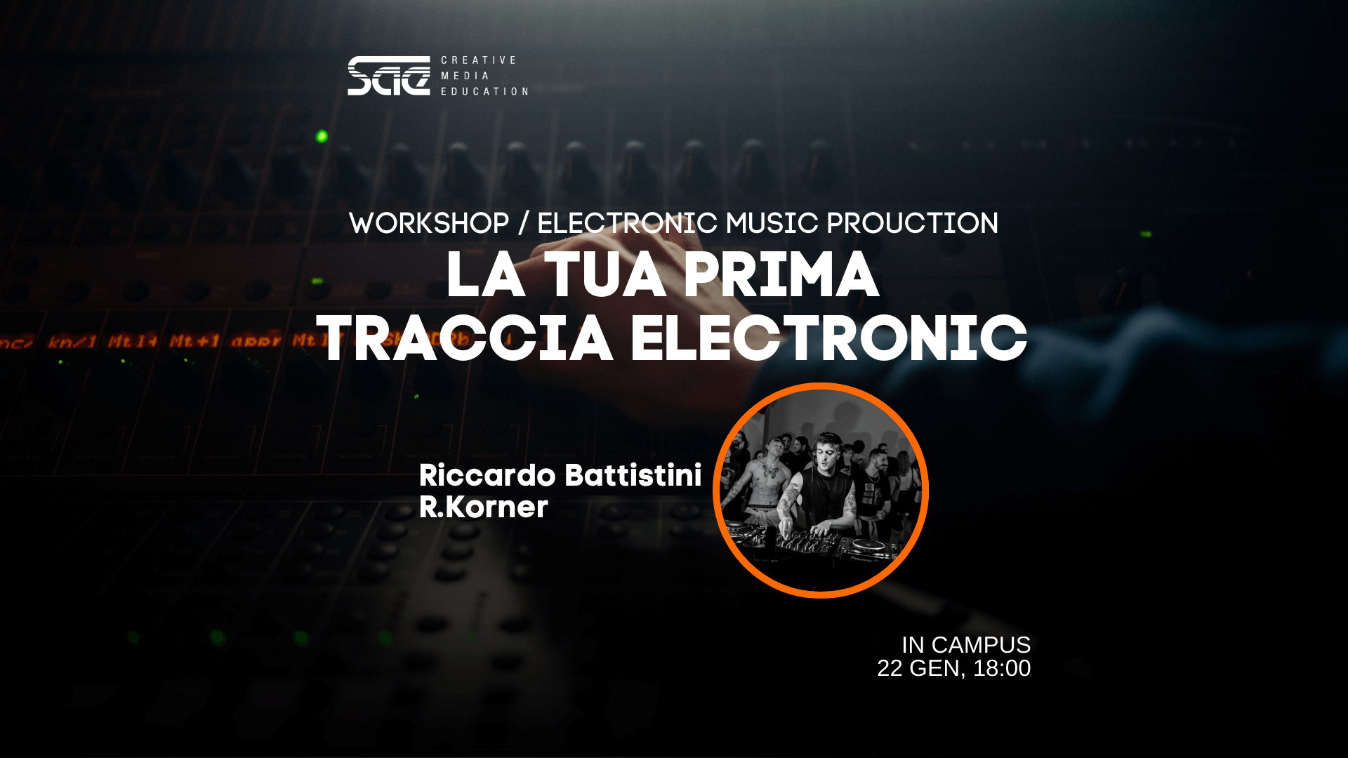 Guidati dal docente di Electronic Music Production Riccardo Battistini (R.Korner), i partecipanti saranno dotati ciascuno di una postazione con Ableton Live. Verranno mostrati i principali elementi di una produzione electronic: beat, bassline, melodia e arrangiamento.
