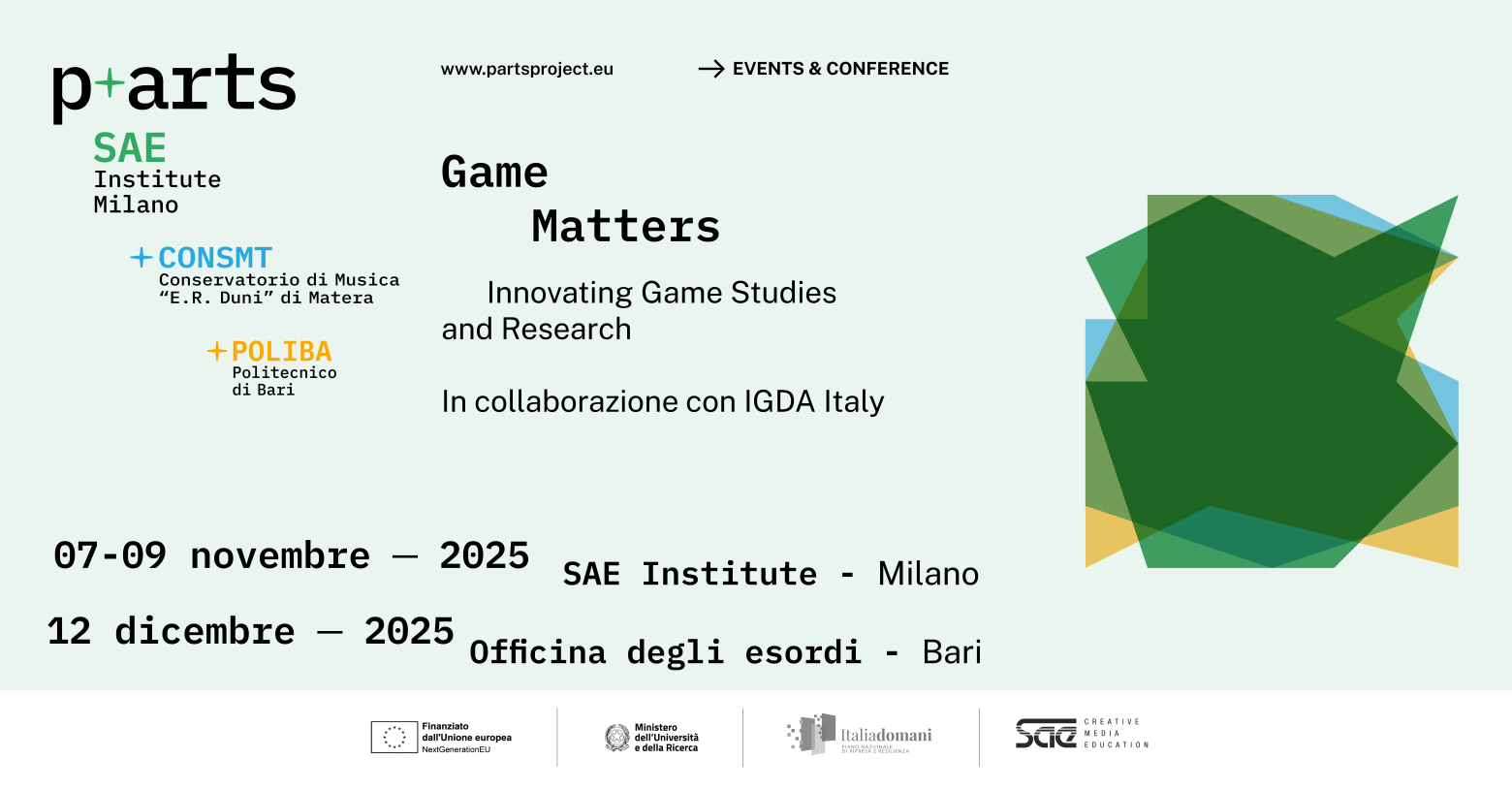 Game Matters si compone di due momenti: una Game Jam presso il Campus di SAE Institute dal 7 al 9 novembre 2025 e un Convegno realizzato in collaborazione con Politecnico di Bari e Conservatorio di Matera, con l’obiettivo di esplorare il ruolo dell’innovazione negli studi e nelle pratiche di game design, mettendo in dialogo prospettive accademiche, artistiche e professionali.